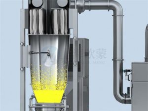 空氣經(jīng)加熱凈化后,由引風(fēng)機(jī)從下部導(dǎo)入,穿過料斗的孔網(wǎng)板。在工作室內(nèi),經(jīng)攪拌和負(fù)壓作用形成流態(tài)化,水份快速蒸發(fā)后隨著排氣帶走,物料快速干燥。